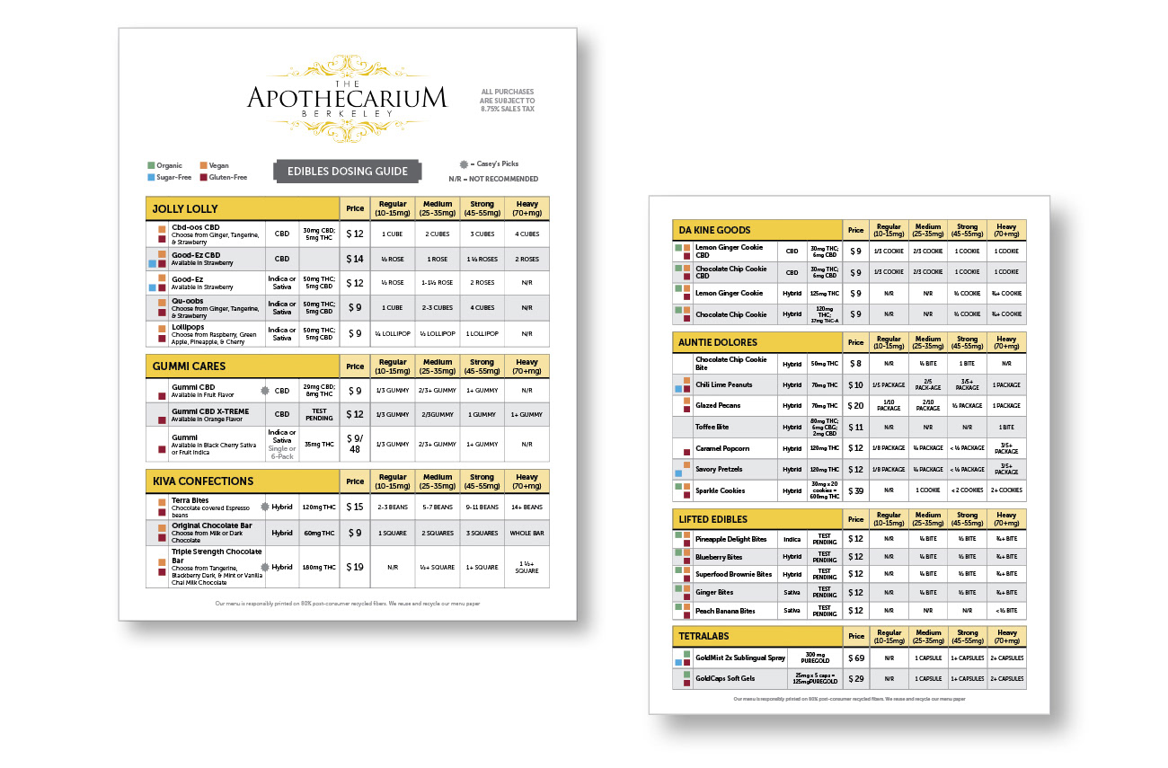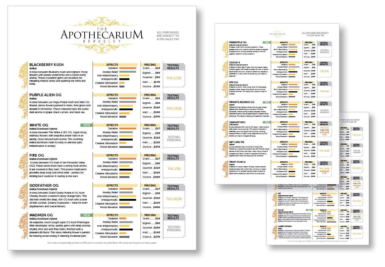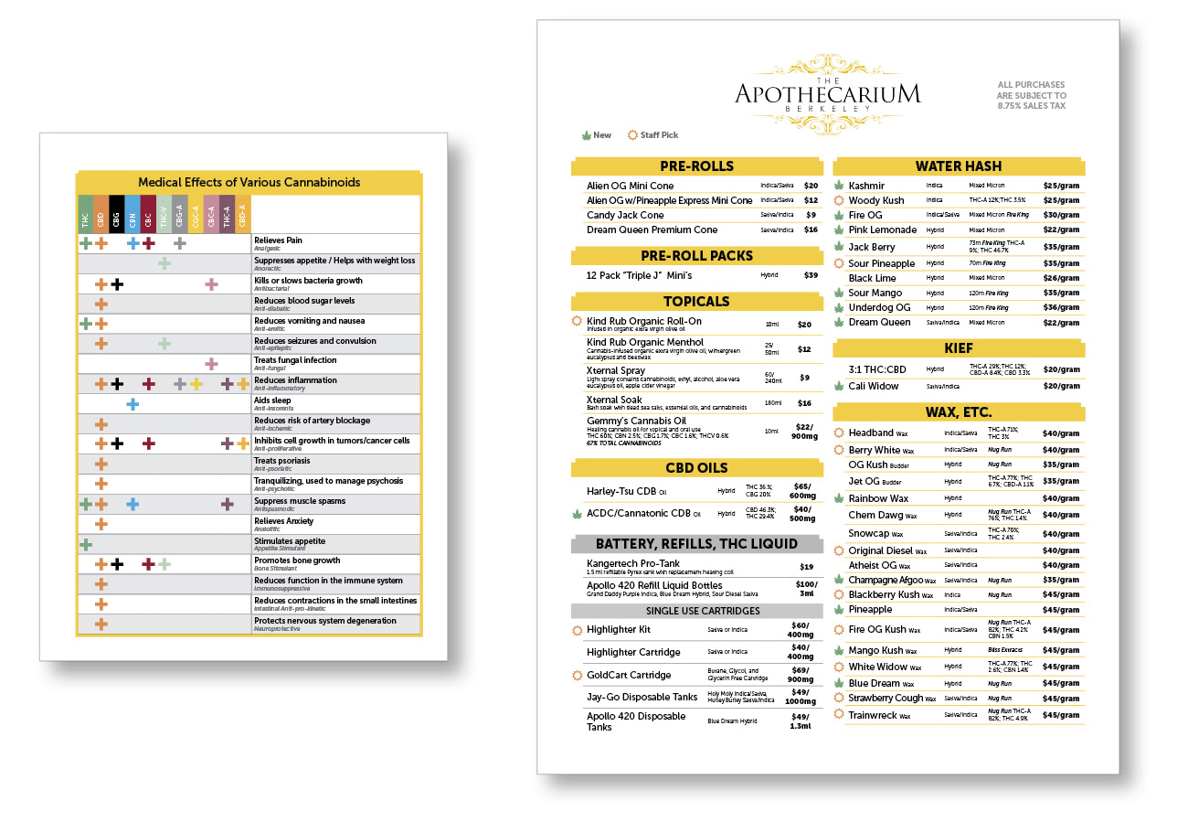 Design of in-store menus and dosing guides for their current and future locations. Proposal binder and graphics for their applications to the state to expand.
