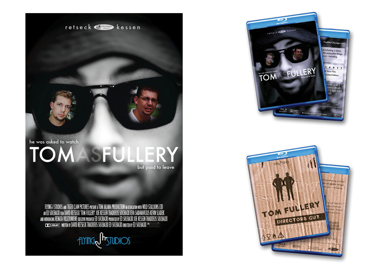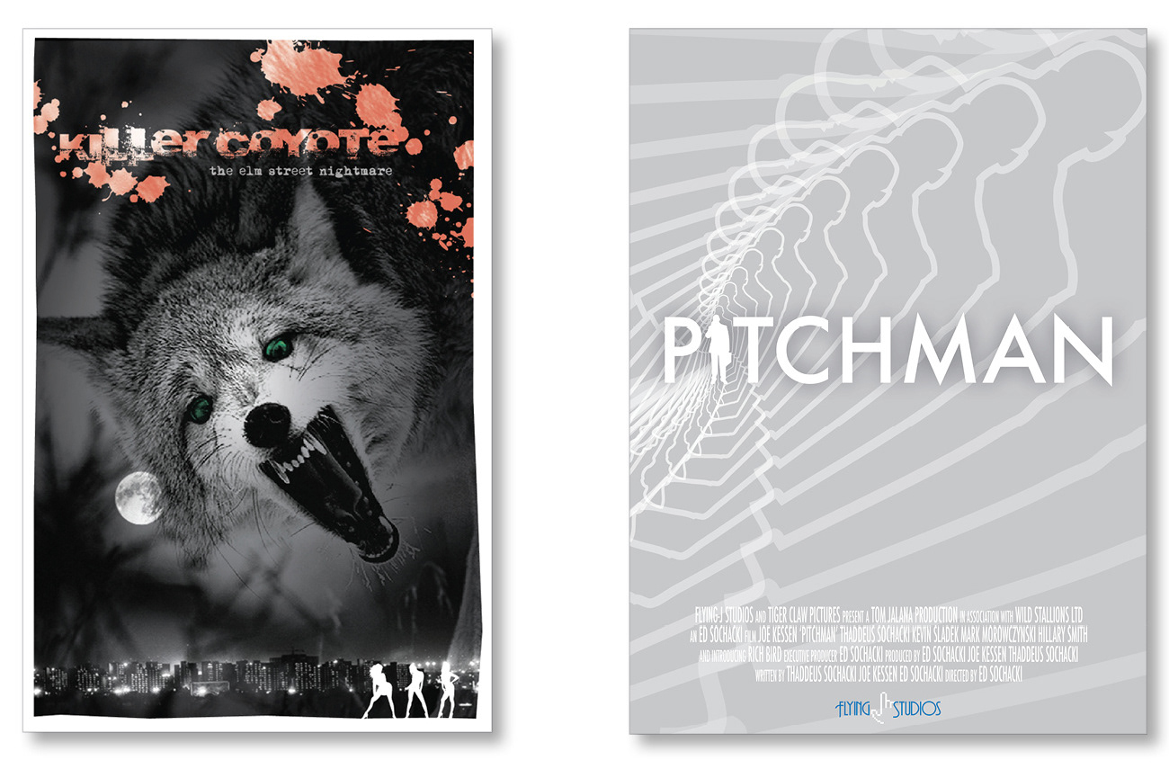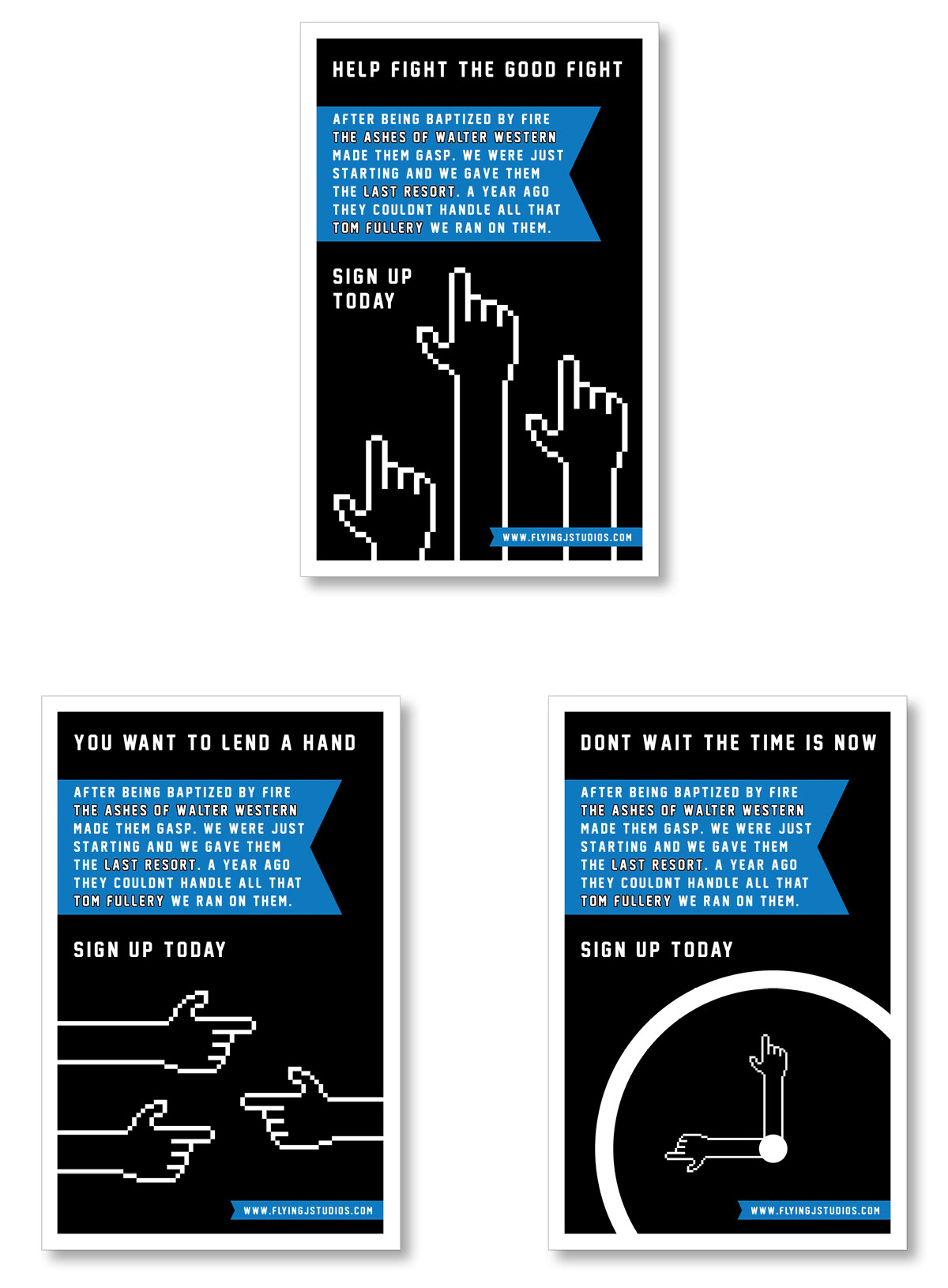 Various movie and recruitment posters along with Bluray cases for Flying-J Studios.