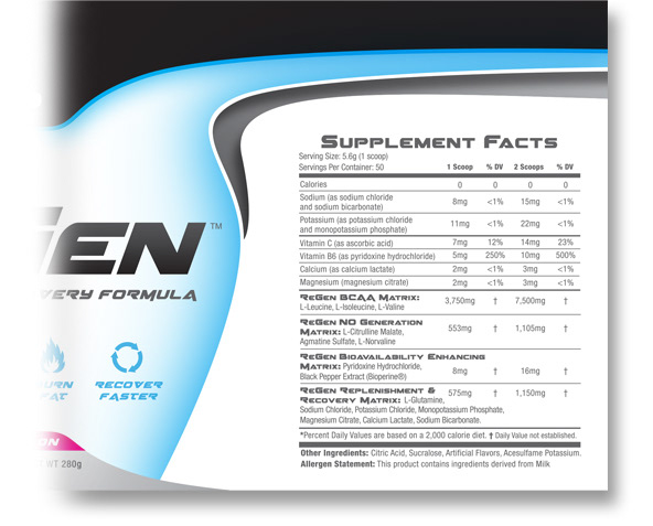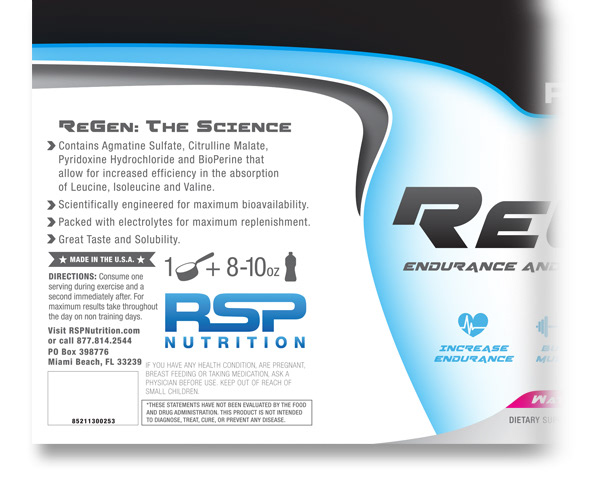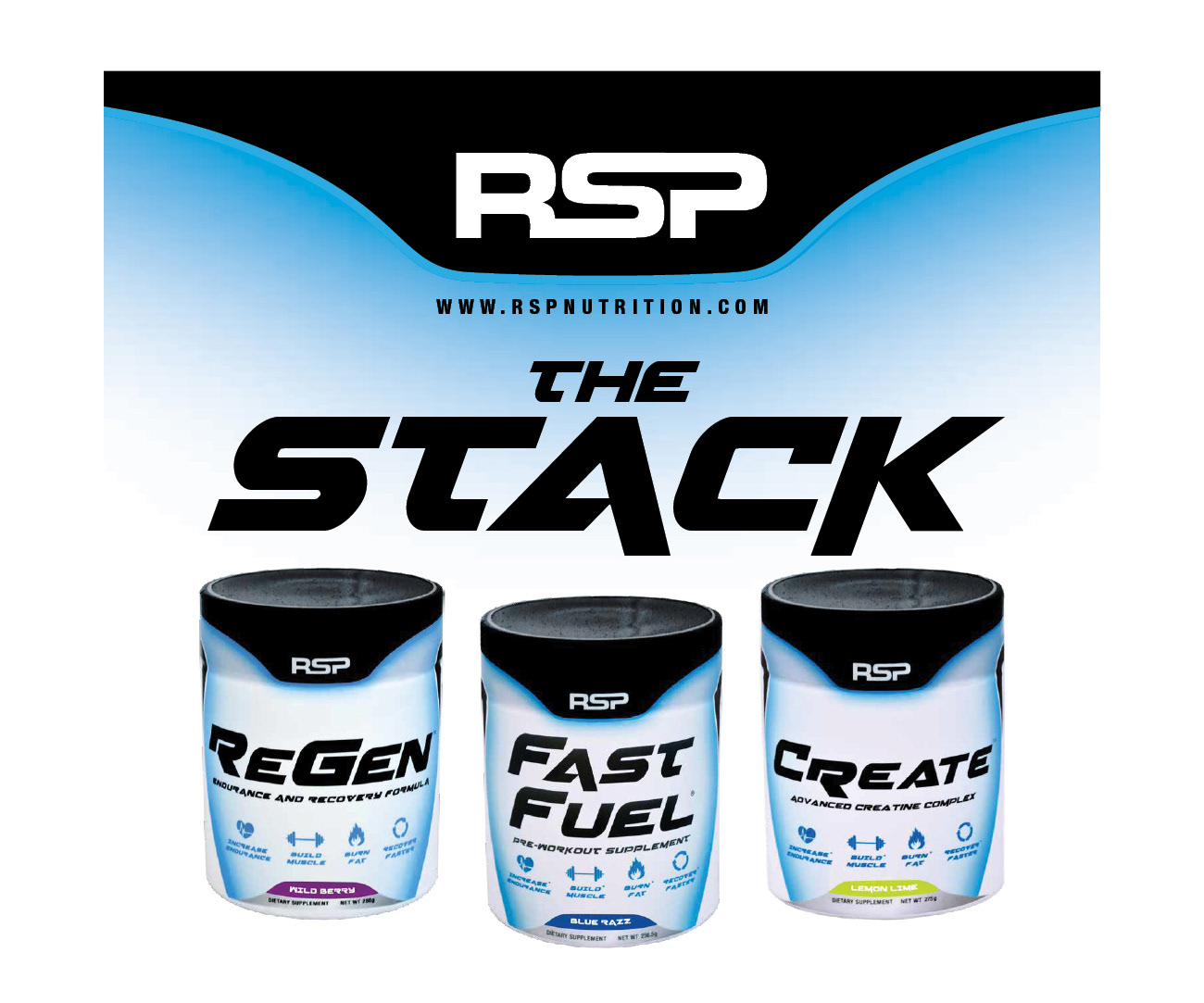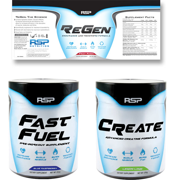 RSP Nutrition's 2nd generation of packaging for its products. The three main products; Fast Fuel, Create and ReGen are shown here.