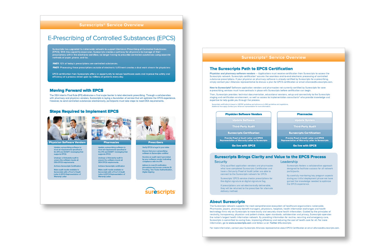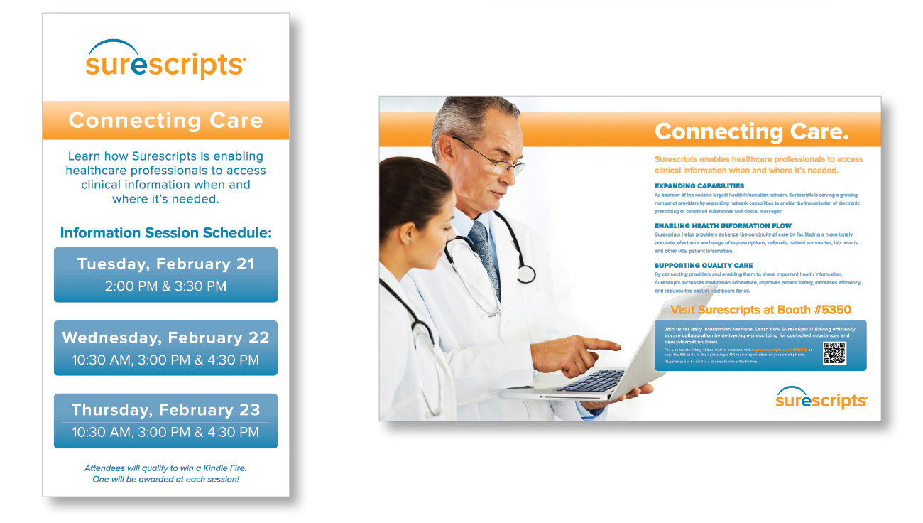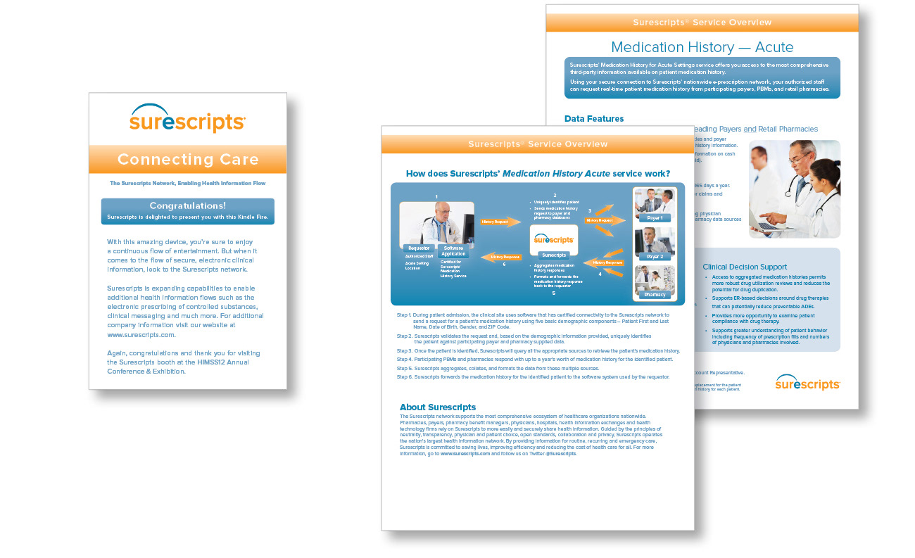 Various marketing materials for the Surescripts trade show booth that explain their services and benefits to customers.