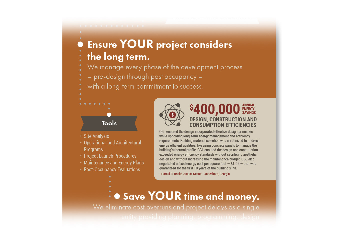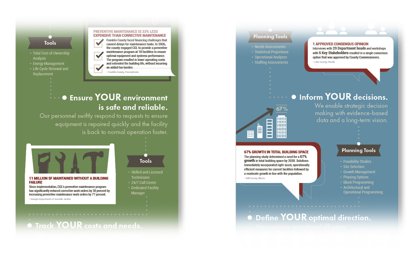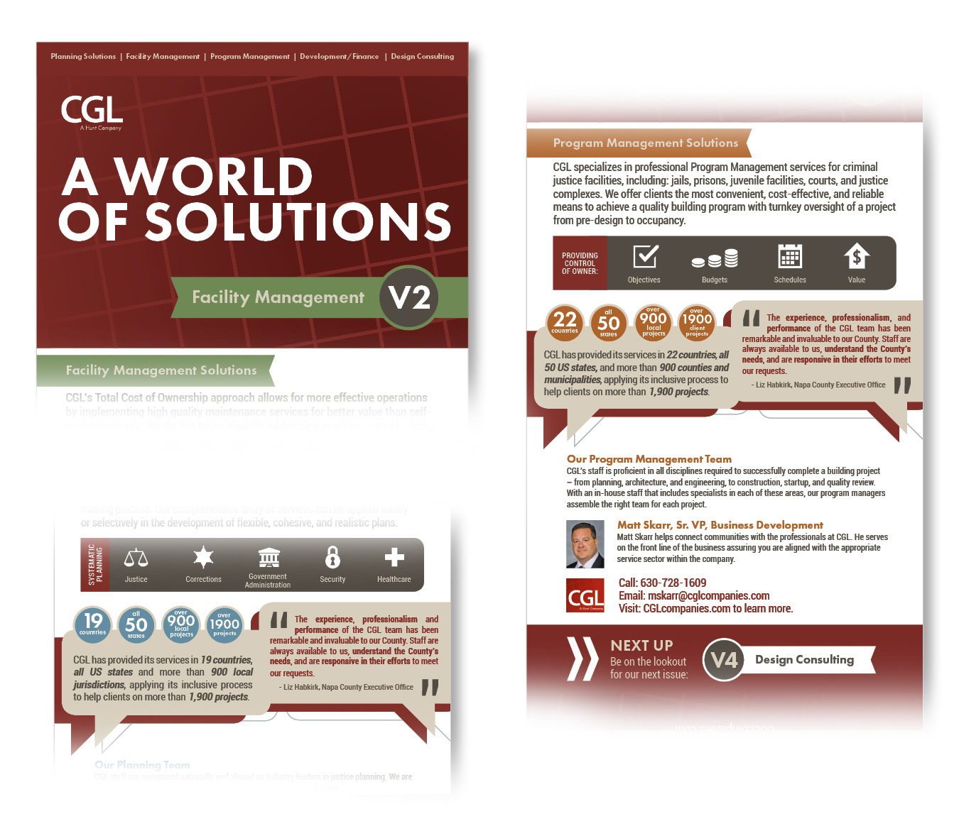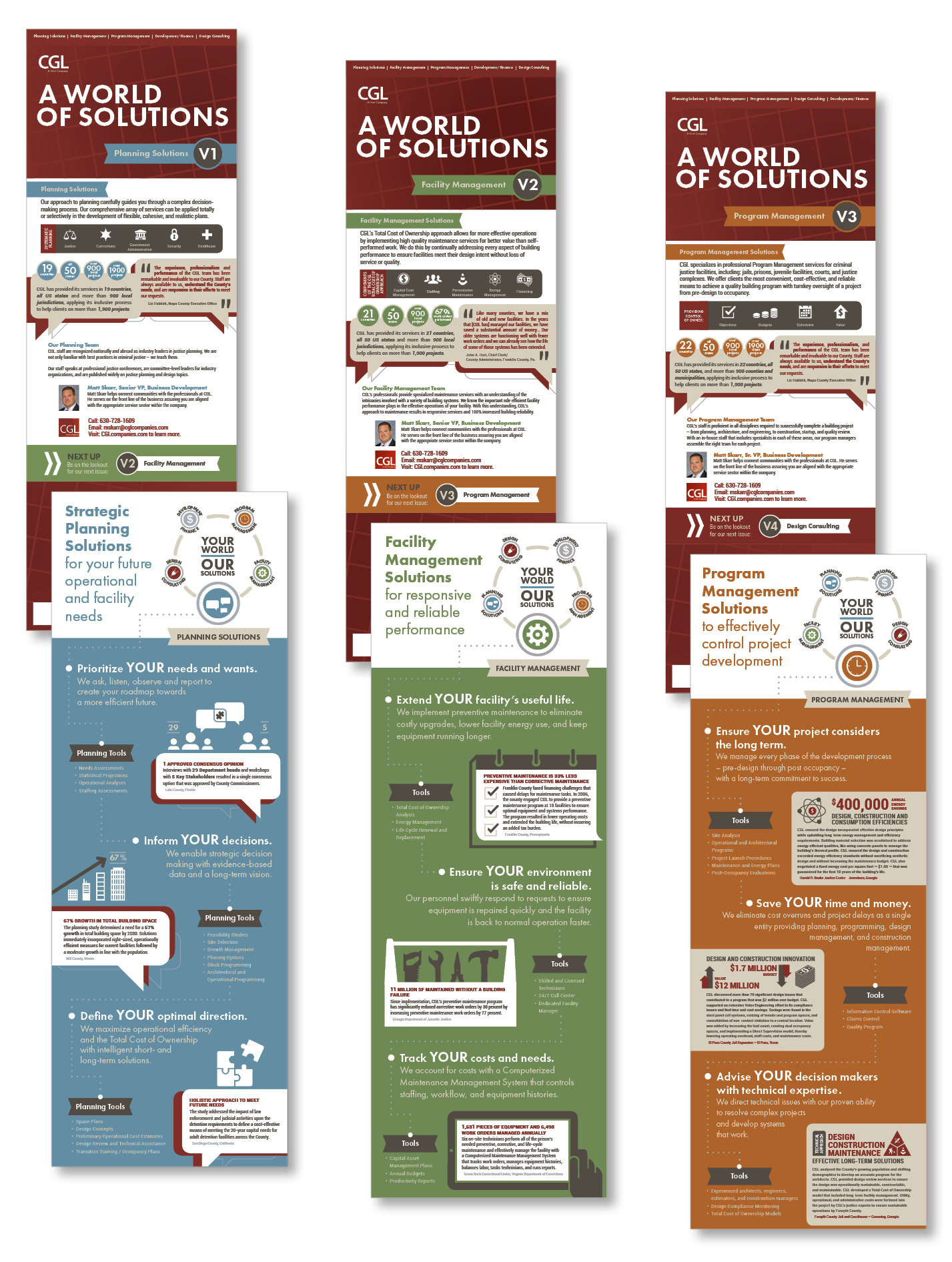 A three volume mailer from CGL Companies sent out to current and prospective clients to fully breakdown their full suite of services.